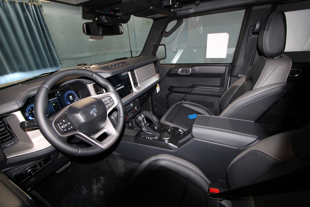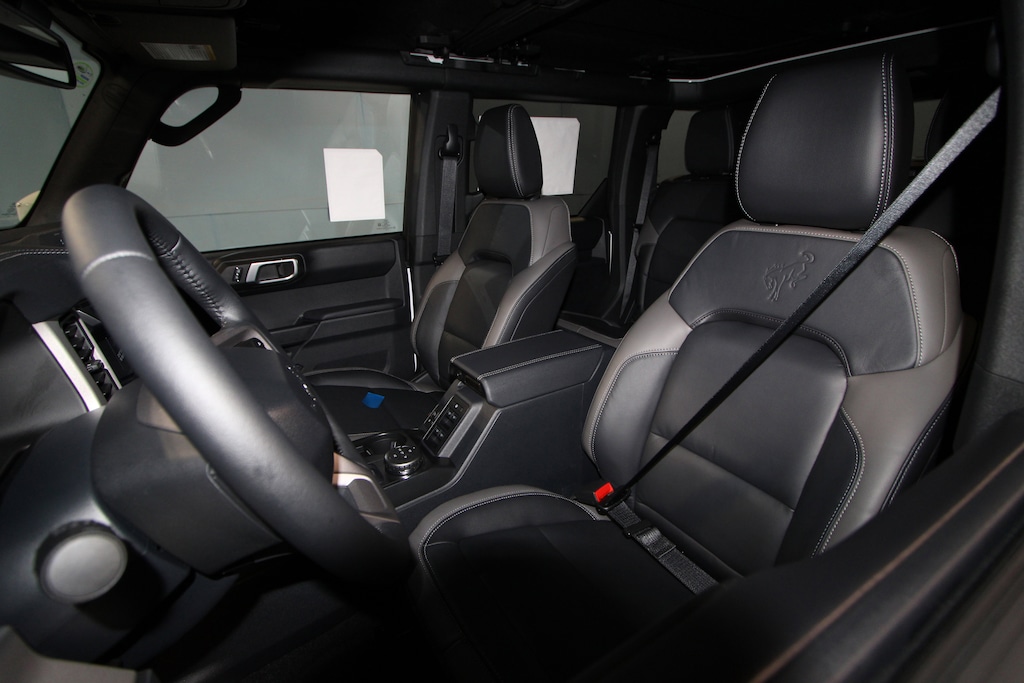 18" Bright Machined Aluminum Wheels, 360-Degree Camera, 4-Wheel Disc Brakes, 7 Speakers, ABS brakes, Adaptive Cruise Control, Air Conditioning, Alloy wheels, AM/FM radio: SiriusXM with 360L, AM/FM Stereo, Auto High-beam Headlights, Auto-dimming Rear-View mirror, Automatic temperature control, Brake assist, Compass, Connected Navigation, Delay-off headlights, Driver door bin, Driver vanity mirror, Dual front impact airbags, Dual front side impact airbags, Electronic Stability Control, Emergency communication system: 911 Assist, Equipment Group 314A Lux Package, Evasive Steering Assist, Exterior Parking Camera Rear, Ford Connectivity Package (1-Year Included), Front anti-roll bar, Front Bucket Seats, Front Center Armrest, Front dual zone A/C, Front fog lights, Front Parking Sensors, Front reading lights, Front wheel independent suspension, Fully automatic headlights, Hard Top Sound Deadening Headliner, Heated door mirrors, Heated front seats, Heated Leather-Trimmed/Vinyl Bucket Seats, Heated steering wheel, High Clearance Fender Flares, High Clearance Suspension, Illuminated entry, Information on Demand Panel, Integrated roll-over protection, Leather Shift Knob, Low tire pressure warning, Navigation system: Connected Navigation, Occupant sensing airbag, Outside temperature display, Overhead airbag, Overhead console, Panic alarm, Passenger door bin, Passenger vanity mirror, Position-Sensitive Bilstein Shock Absorbers, Power door mirrors, Power driver seat, Power passenger seat, Power steering, Power windows, Radio data system, Rear seat center armrest, Rear-Window Defroster and Washer, Remote keyless entry, Sasquatch Package, Security system, Shadow Black-Painted Hard Top, Sideview Mirrors, SiriusXM with 360L, Speed control, Split folding rear seat, Steering wheel mounted audio controls, SYNC 4, Tachometer, Telescoping steering wheel, Tilt steering wheel, Traction control, Trip computer, Variably intermittent wipers, Voltmeter, Wheels: 17" Matte Black Alloy.